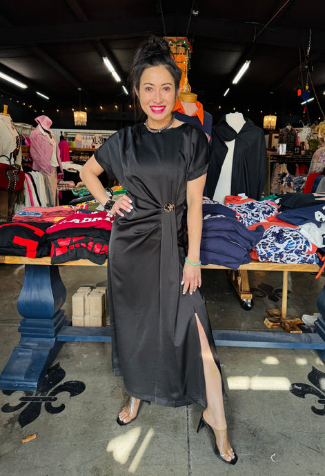 Glam - Gathered Metal Trim Short Sleeve Midi Dress