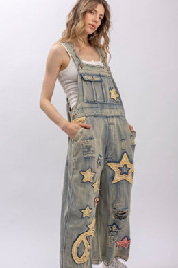 Bluevelvet-Star and Peace Patchwork Denim Bib Overalls