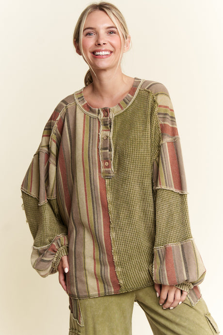 J. Her - Mineralwash Half Striped Waffle Henley Top