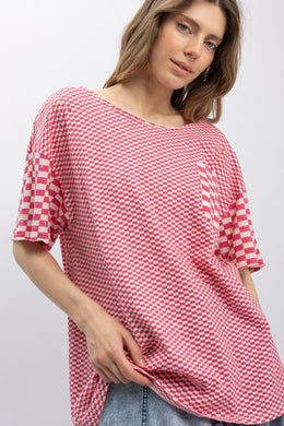 Checkerboard Print Mix Short Sleeve Tee Shirt