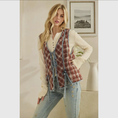 BiBi - Olive Rust Plaid Piping Detail Quilted Vest