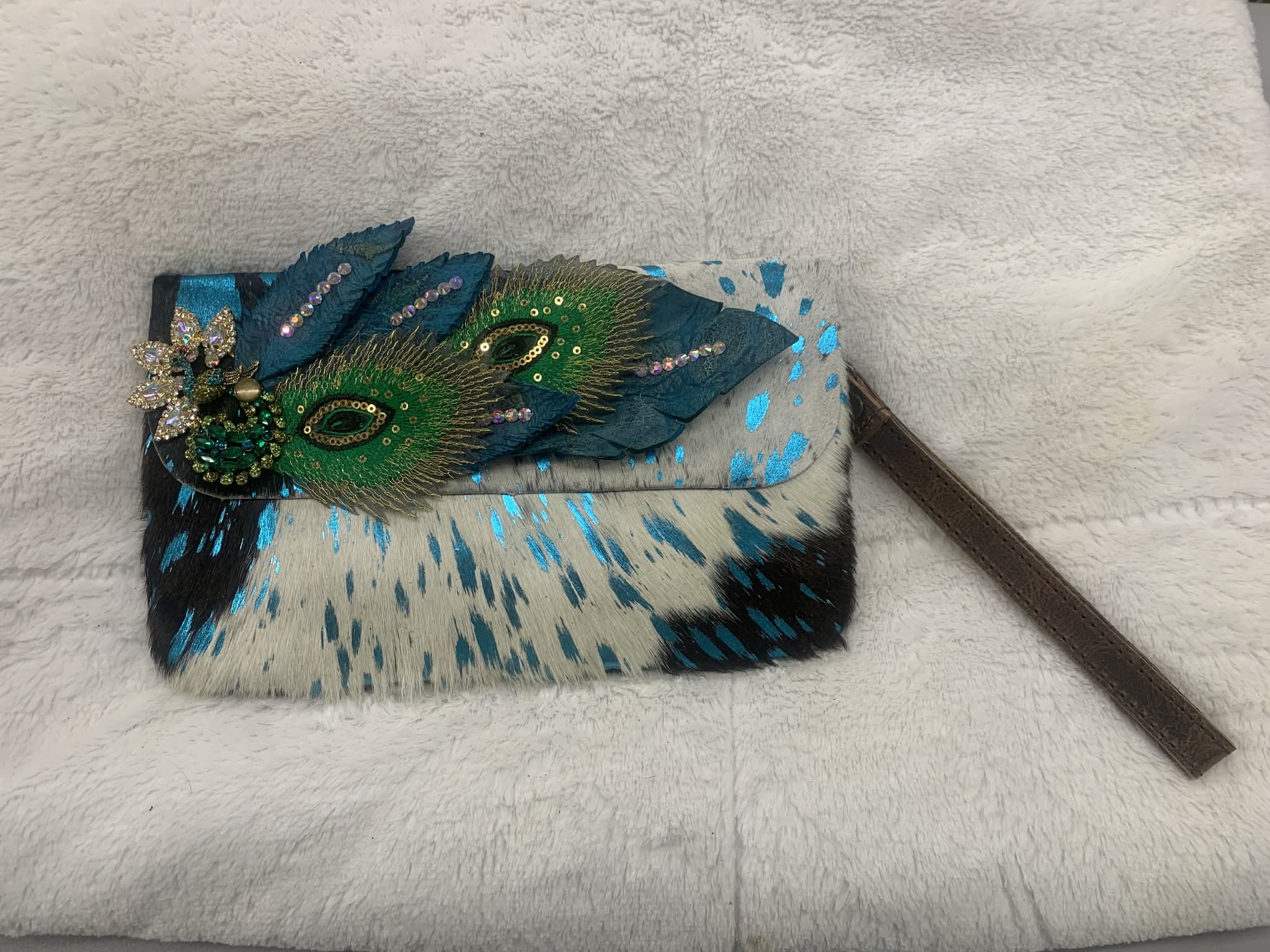 Spot something special with this charming peacock blue, green and cream clutch crossbody—a rare find that's as fun to carry as it is fabulous to wear. Perfect for hands-free adventures, this versatile piece transitions seamlessly from day to night, keeping your essentials close while your style stays on point.