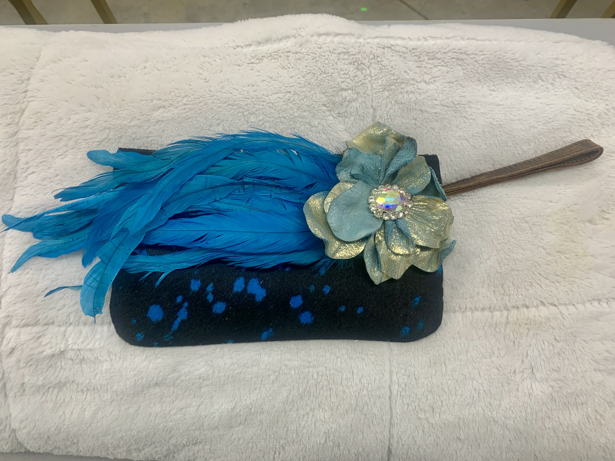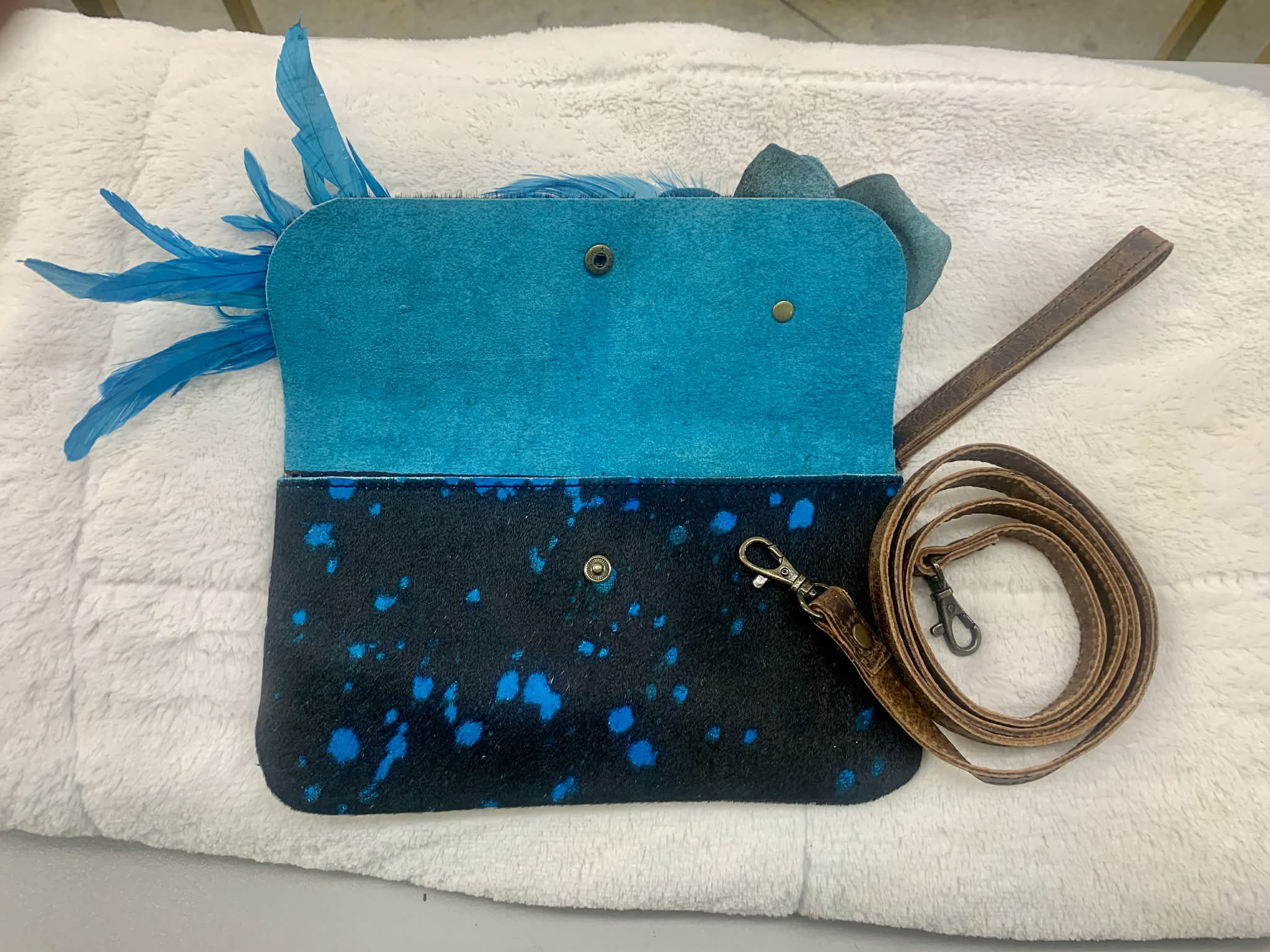 Spot something special with this striking clutch crossbody featuring bold black and blue feathers. Perfect for hands-free carrying with an adjustable strap, this playful piece brings a touch of whimsy to any outfit. Whether you're running errands or heading out for the evening, this rare find keeps your essentials close while making a statement.