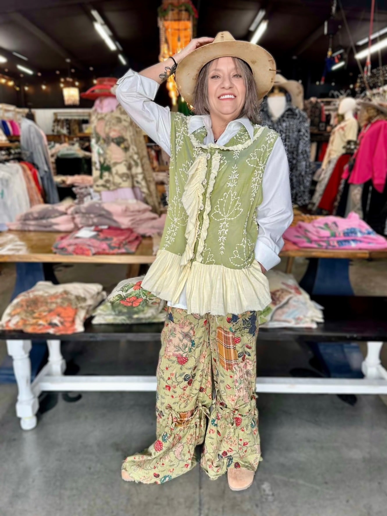Spot something special in your closet with this charming vintage vest. The soft green and cream palette brings effortless sophistication to any outfit, while the timeless silhouette works beautifully layered over basics or dressed up for a statement look. Perfect for collectors of unique pieces and anyone who loves vintage charm with modern versatility.