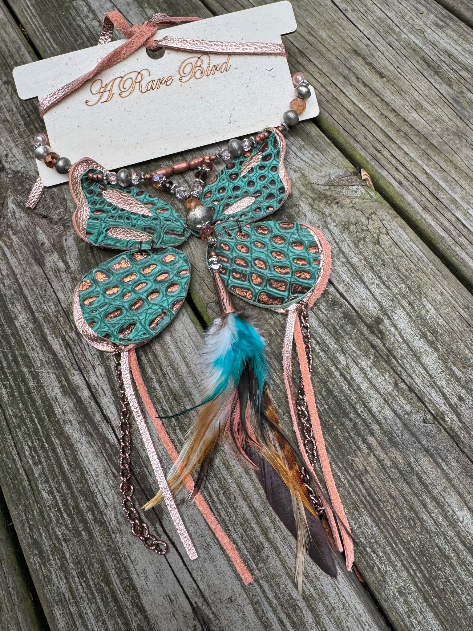 Discover the unique and elegant A Rare Bird-Teal Leather Butterfly Necklace. Crafted with teal leather and a beautiful butterfly pendant, this necklace is a must-have for any fashion-forward individual. Show off your individuality with this rare and stunning piece.