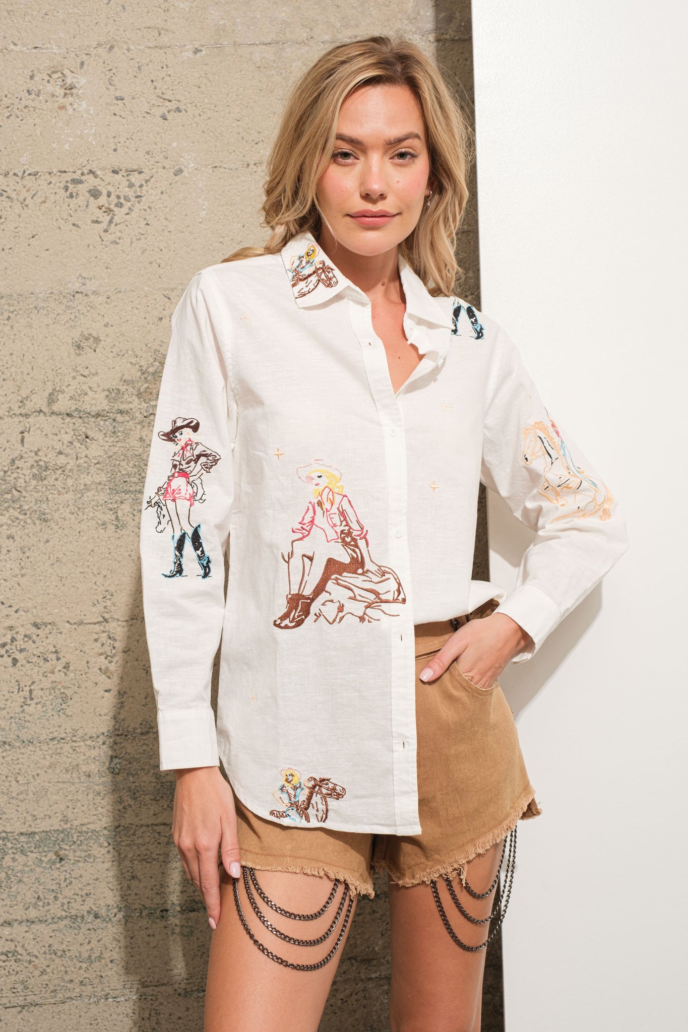 The embroidered cowgirl motifs featured on this boxy-fit, airy linen-cotton shirt are inspired by a novelty tablecloth from the '50s-'60s.