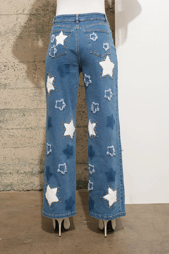 These fun mid-rise jeans feature a stretchy fit with a playful star print and studded details for an extra touch of sparkle.