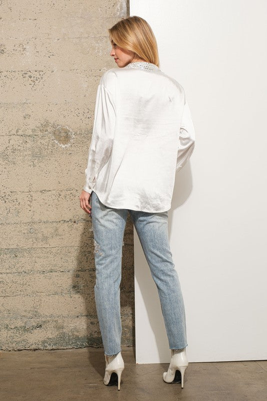 Sparkle and shine in this fabulous satin blouse featuring a chic collar and rhinestone-adorned pocket details. Perfect for adding a touch of glamour to your everyday look, this playful piece combines elegance with just the right amount of pizzazz. The smooth satin fabric drapes beautifully while the glittering rhinestones catch the light with every move. Whether you're dressing up for a special occasion or elevating your casual style, this statement blouse is sure to turn heads and make you feel absolutely fabulous.