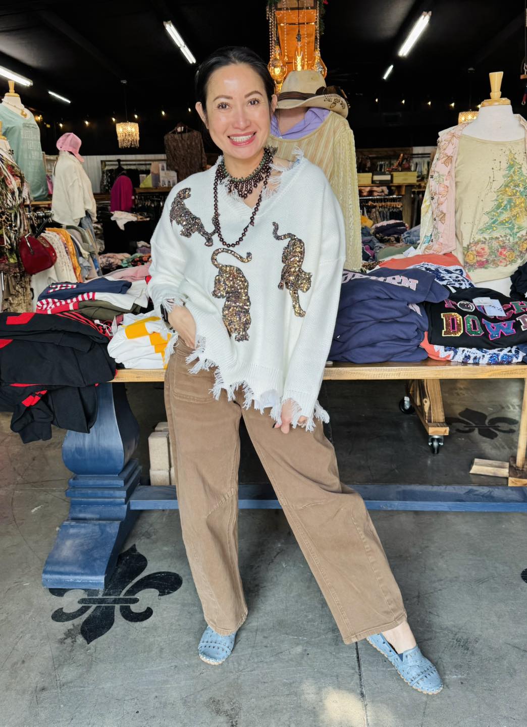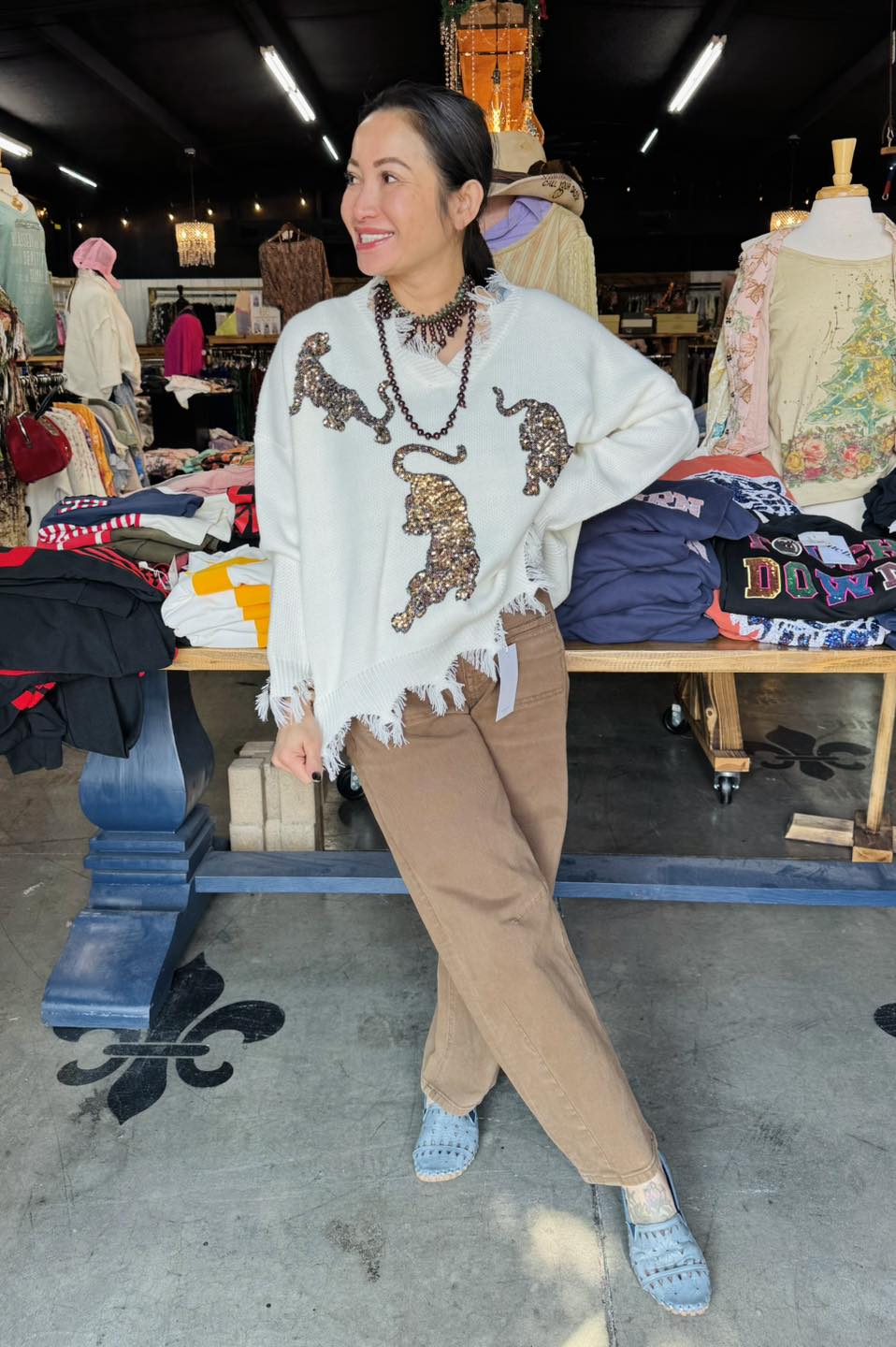 Roar into style with this playful tiger sequin sweater! Featuring a dropped shoulder silhouette and edgy raw hem, it's the perfect blend of fun and fashion-forward design. The shimmering sequin tiger detail adds personality and sparkle to your everyday look. Cozy, cute, and totally Instagram-worthy—this sweater is ready to make a statement.