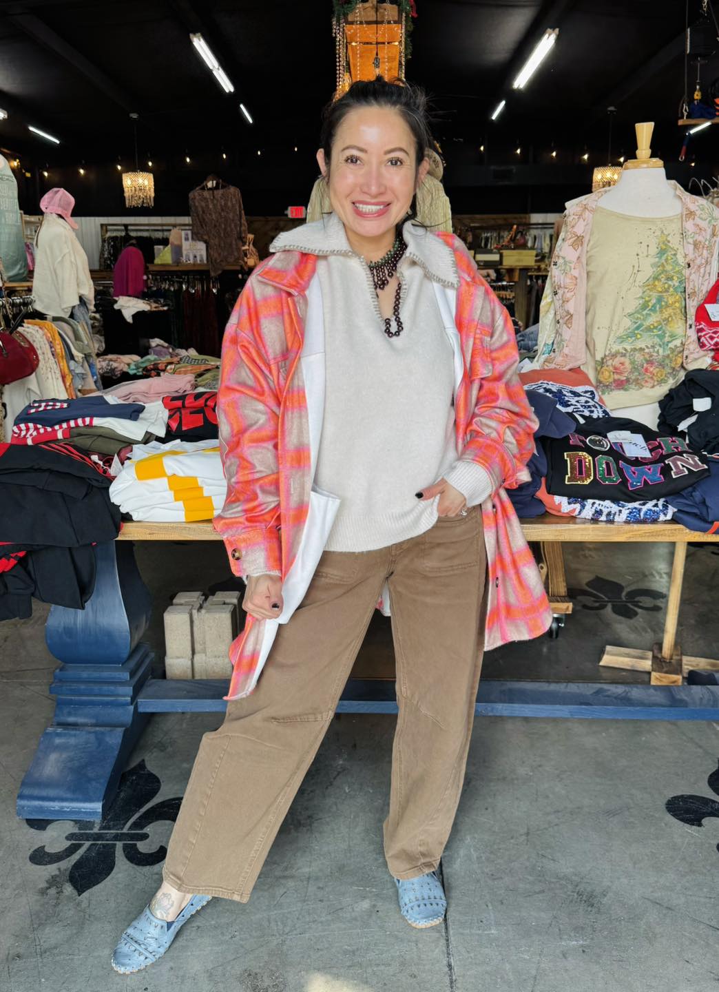 Layer up with this versatile tan and orange shacket from Camille & Co—the perfect piece for effortless style. Whether you're throwing it over a tee or wearing it solo, this shirt-jacket hybrid keeps you looking put-together and feeling cozy. The warm color palette works with everything in your closet, making it a go-to for casual days and weekend adventures alike.