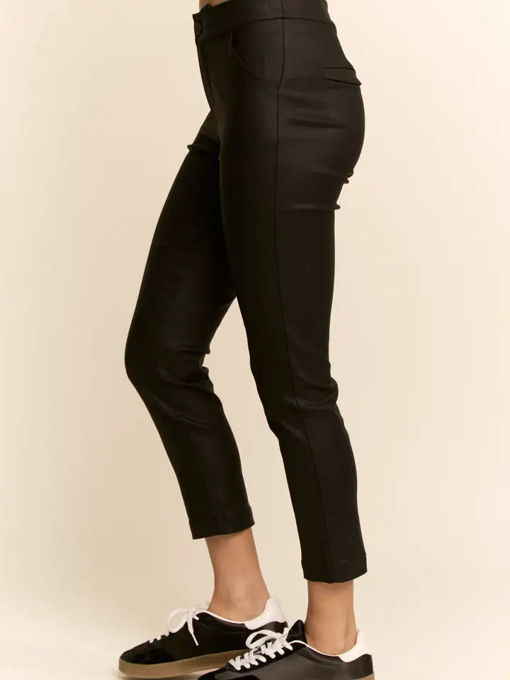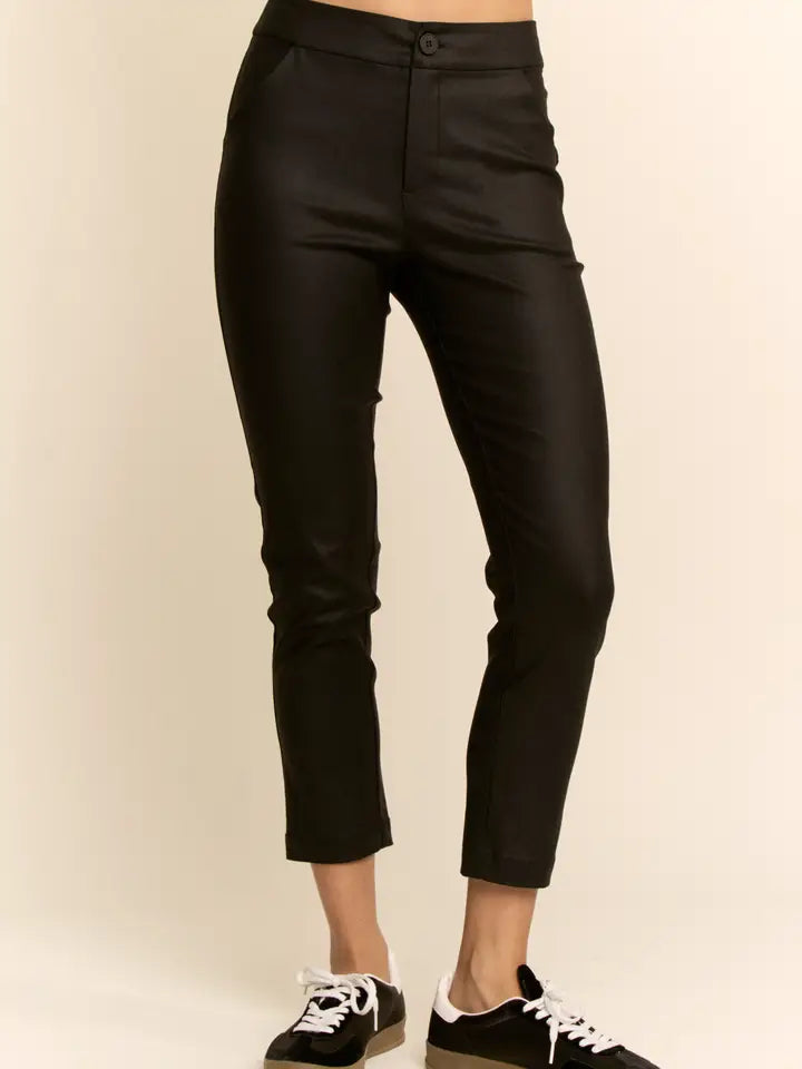 polished faux leather slim ankle pant designed for refined everyday dressing. The clean waistband, subtle stretch, and tapered leg create a smooth, flattering shape that pairs effortlessly with sweaters, blouses, and structured layers. A boutique friendly staple that brings a modern edge to casual outfits while keeping the overall look sleek and versatile for day to night styling.
