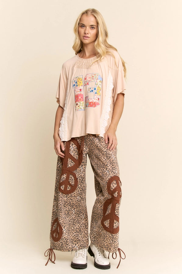 Stand out with these leopard wide leg pants featuring bold peace applique details. Designed with a relaxed fit, adjustable drawstring ties, and contrast patch pockets, they add playful energy to casual looks. A boutique favorite for buyers seeking unique statement styles, these pants blend retro inspiration with everyday versatility, pairing easily with knits, tees, or oversized tops for elevated casualwear.