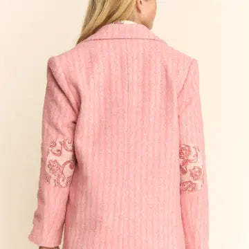 Add a splash of charm to your outfit with the Davi & Dani Pink Herringbone Embroidered Patch Jacket. This playful piece features a soft pink herringbone pattern, brought to life with vibrant embroidered patches that add personality and fun. Lightweight yet cozy, it’s perfect for layering on breezy days while showcasing your unique style with a delightful twist.