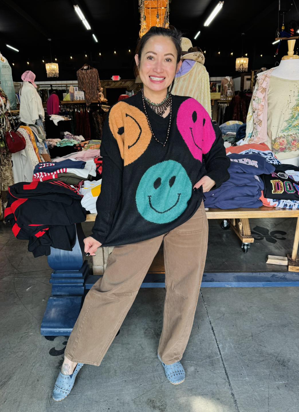 Brighten up any day with this cheerful sweater featuring an iconic smiley face design. Perfect for adding a pop of personality and good vibes to your wardrobe, this cozy piece brings instant happiness to your everyday style. Whether you're heading out for a casual day or want to spread smiles wherever you go, this sweater is your go-to for comfort meets fun.