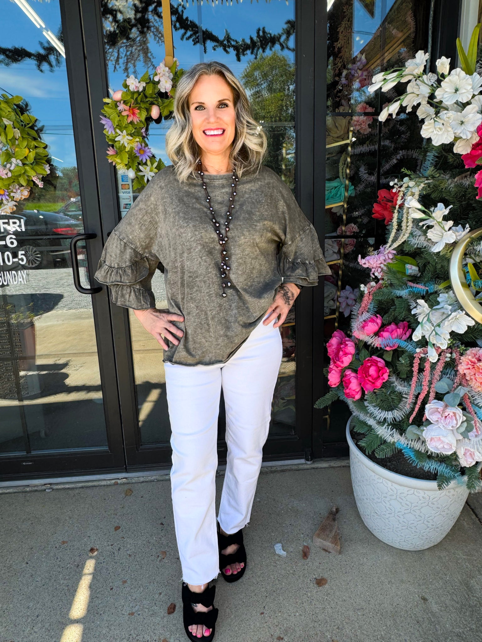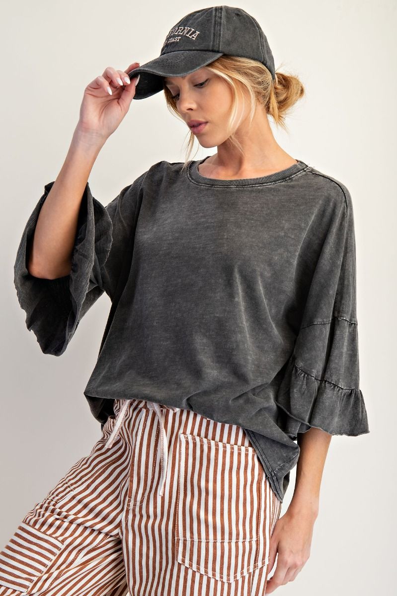WING RUFFLE SLVS WASHED COTTON SLUB TOP -RELAXED, LOOSE-FIT SILHOUETTE -DROPPED SHOULDERS -MINERAL WASHED -3/4 LENGTH RUFFLE SLEEVES -EXPOSED CENTER SEAM DETAIL ON BACK -SMALL MEASUREMENTS : LENGTH - 25" & BUST - 25.5"