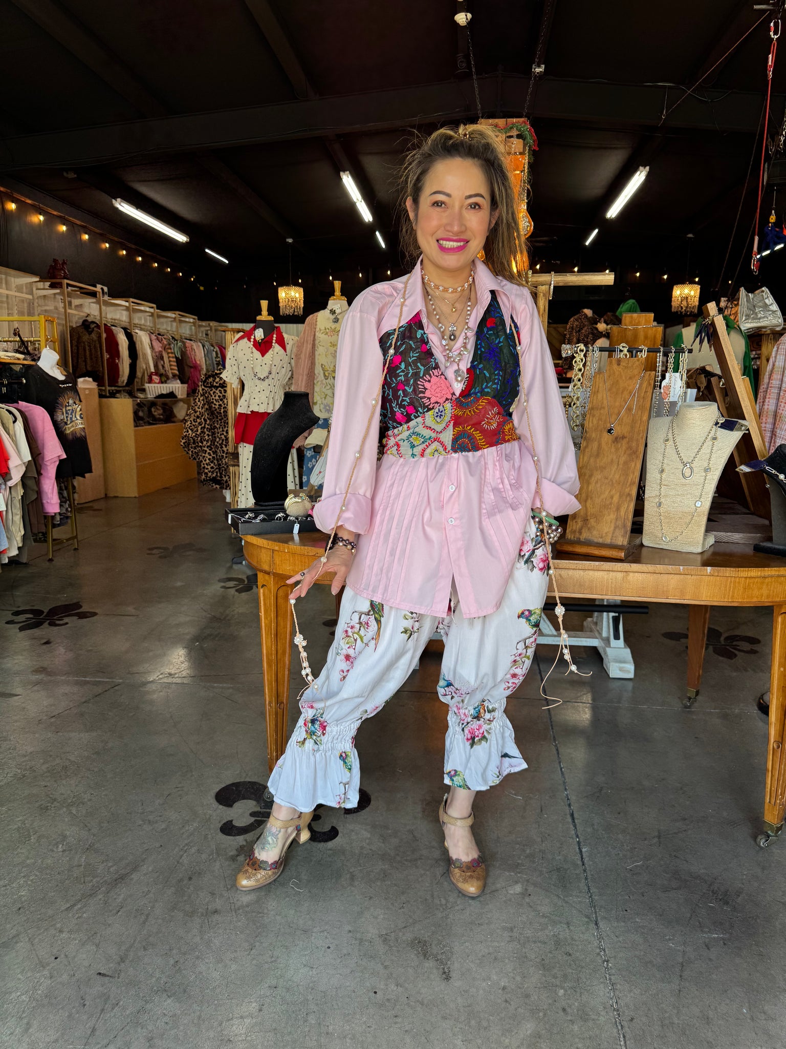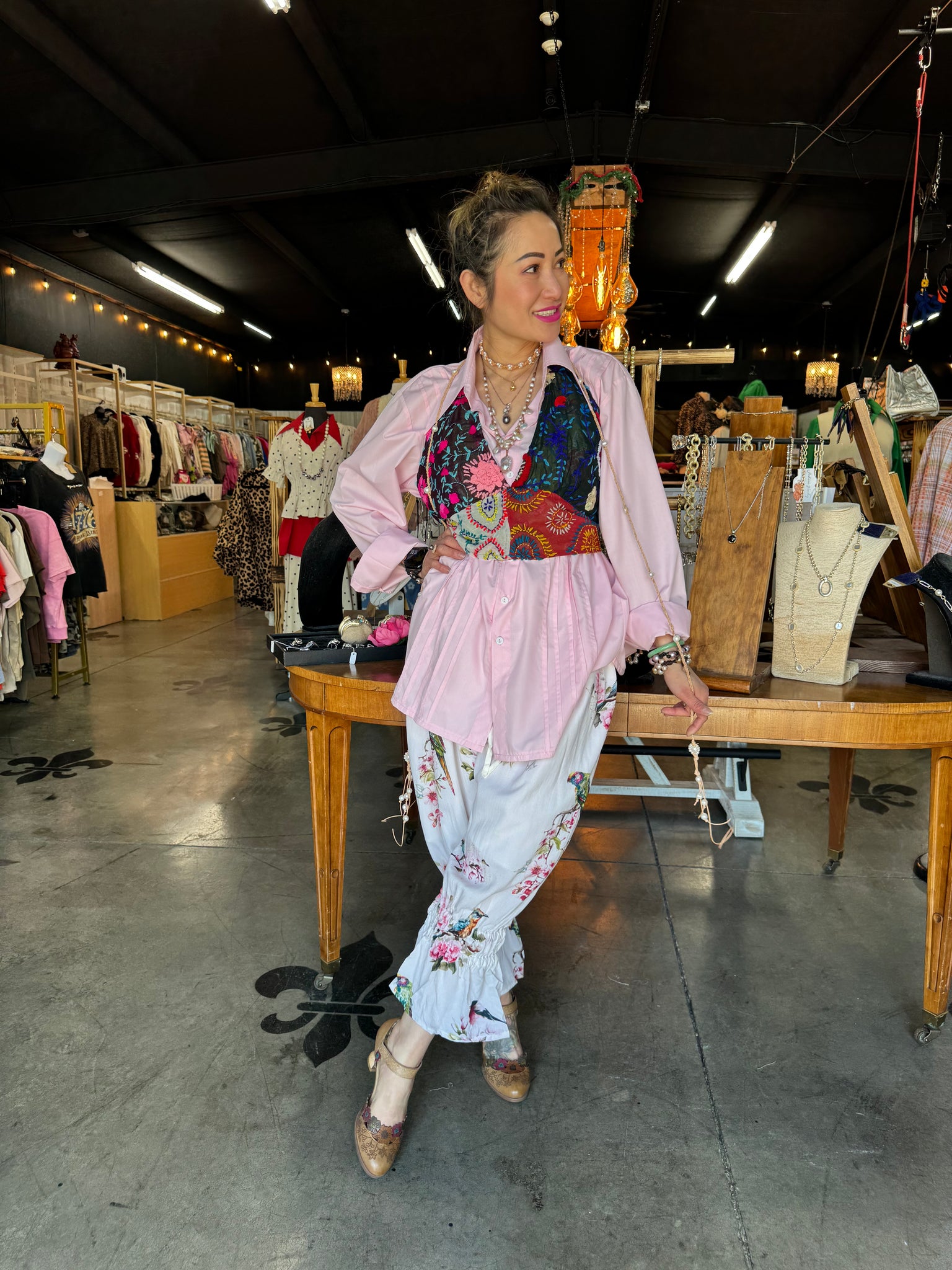 They tie behind the neck and waist for an adjustable fit. Each top is one-of-a-kind.