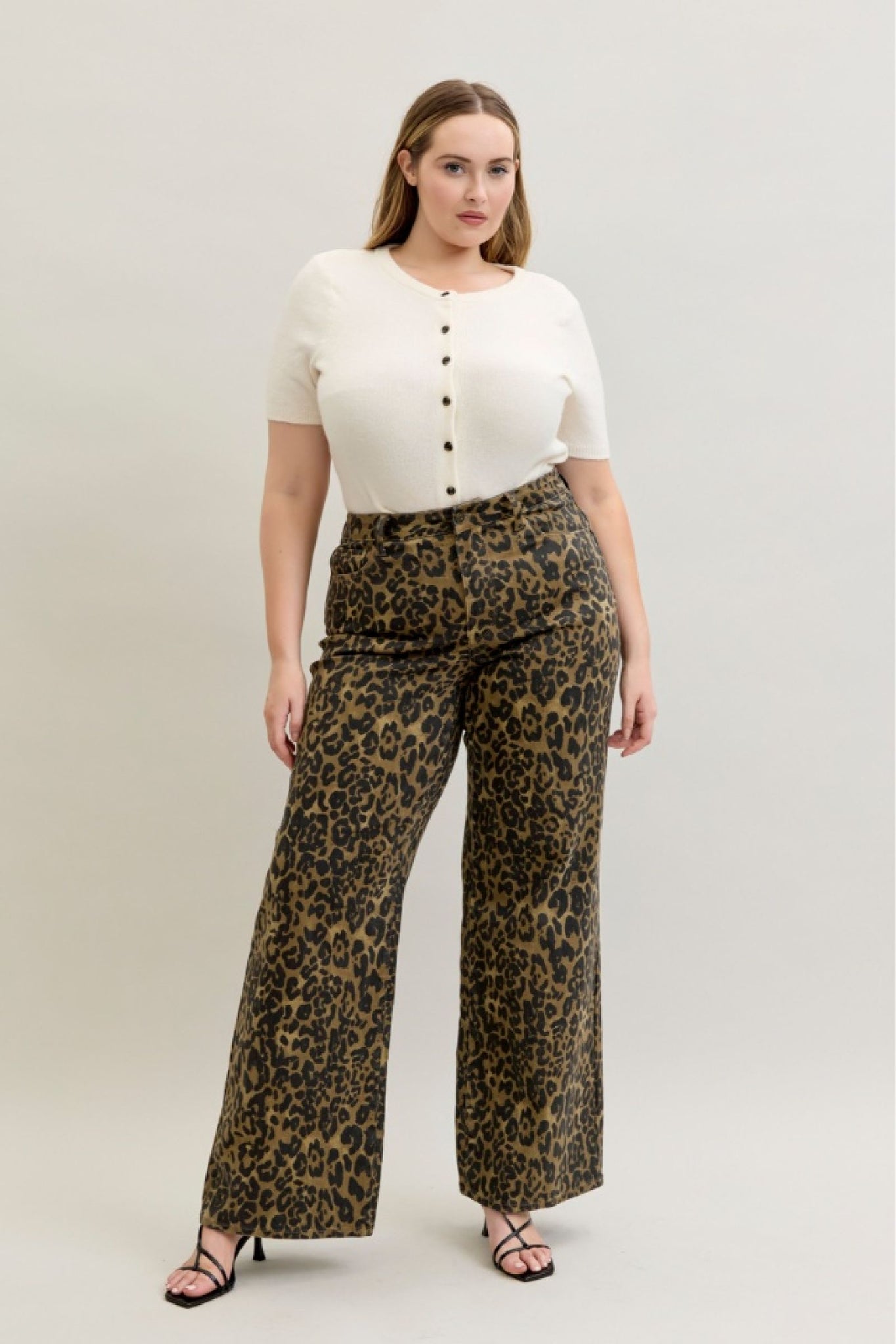 Make a bold statement with these high-waisted, wide-leg jeans featuring a fierce leopard print for a retro-inspired look.