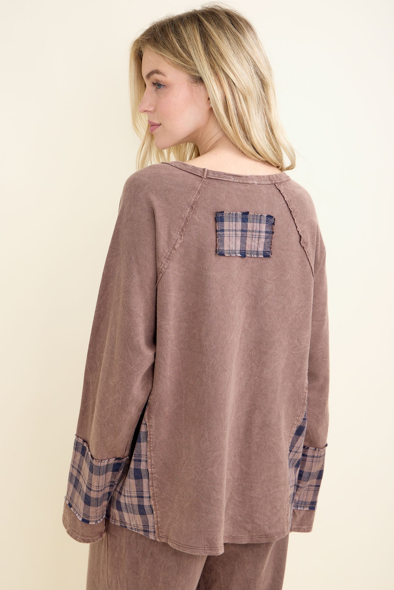 Embrace bold style with the J. Her Mineral Washed Plaid Top, featuring a daring distressed look and a standout star patch for edgy flair.