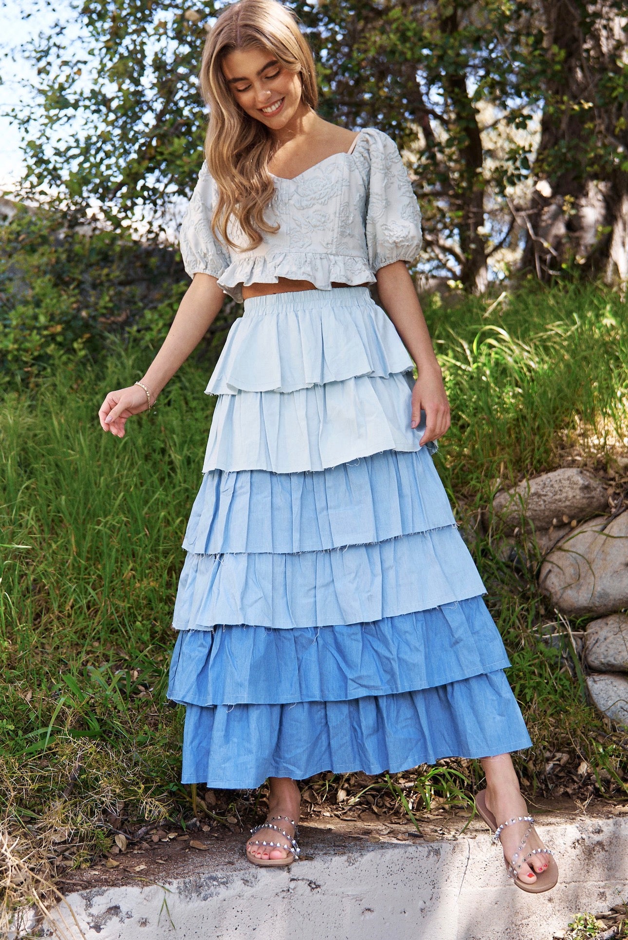 J.NNA - BLUE MULTI LAYER SKIRT Twirl into the moment with this stunning multi-layer skirt in rich blue tones. Designed for those who love movement and dimension, each cascading layer creates effortless flow and visual interest whether you're dressing up or keeping it casual. The thoughtful layering adds depth and texture, making this piece a versatile go-to that transitions seamlessly from day to night. Perfect for anyone who believes fashion should be fun, flirty, and full of personality.