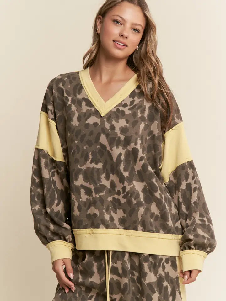 Unleash your wild side with this playful patchwork sweater top featuring bold leopard print panels and a flattering V-neckline. Perfect for mixing prints and making a statement, this cozy layer brings fun texture and attitude to any outfit. Whether you're dressing up or keeping it casual, this sweater delivers style with a roaring good time.