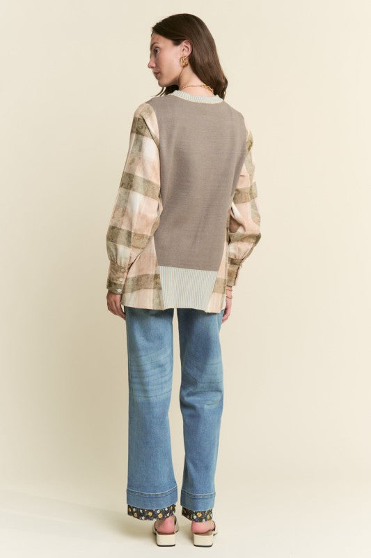 Discover your new go-to: the J.nna women's long-sleeve knit top with an adorable horse motif. This lively top mixes plaid and striped knits for a whimsical look, topped off with a stylish high-low hem that adds a touch of fun.