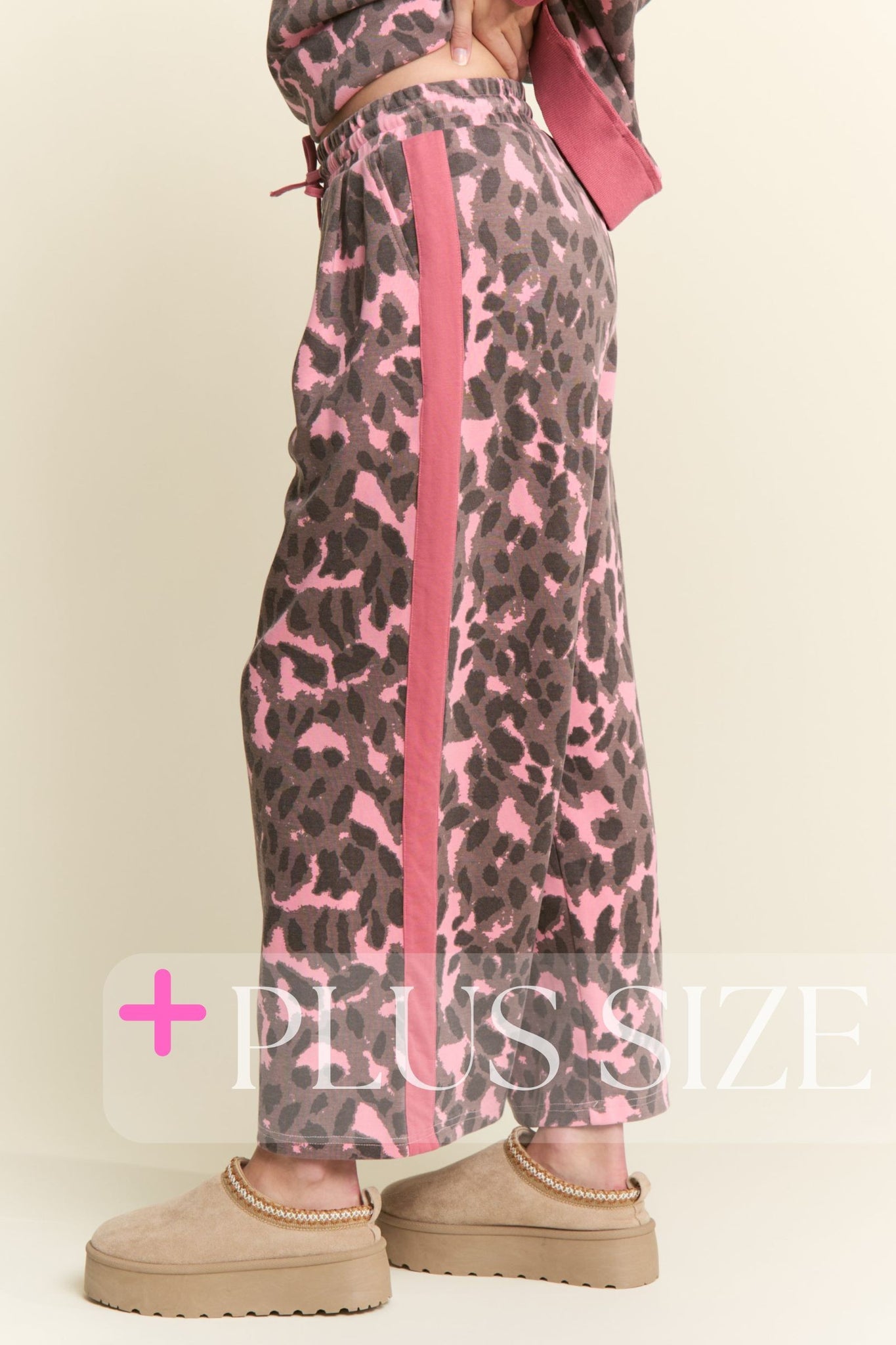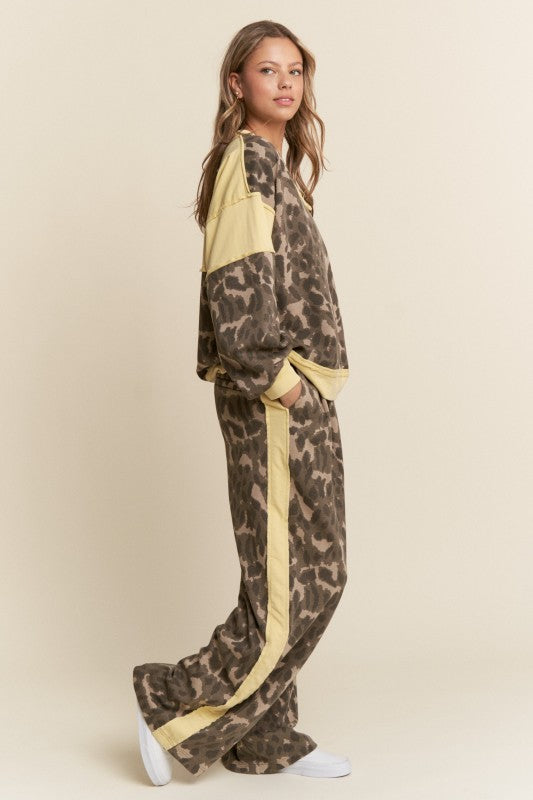 By J. nna, these women's wide leg pants feature a fun leopard print and a bold solid stripe down the side, complete with a comfy drawstring waist for the perfect fit.