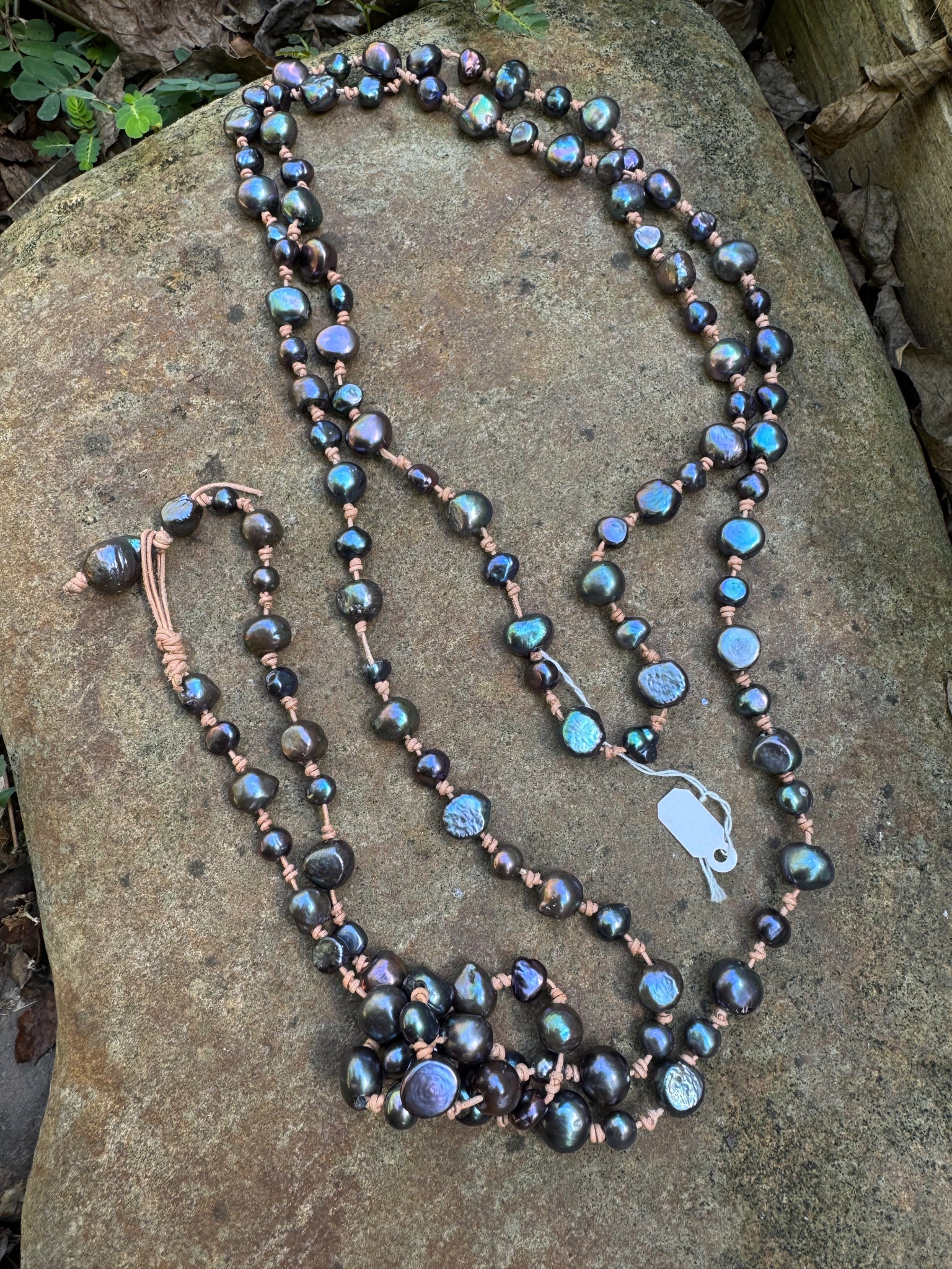 This sleek, long necklace features glossy black freshwater pearls and an adjustable length for the perfect playful twist to any outfit. Hand made by SBMW (Hannah)