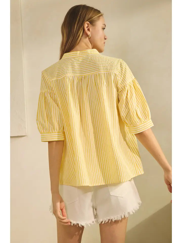 Striped blouse with a banded split neckline, gathered yoke, and relaxed elbow-length sleeves. Also available in sizes 1XL to 3XL: Style no. IT19036P. Total Length: 24" Content: 100% Polyester
