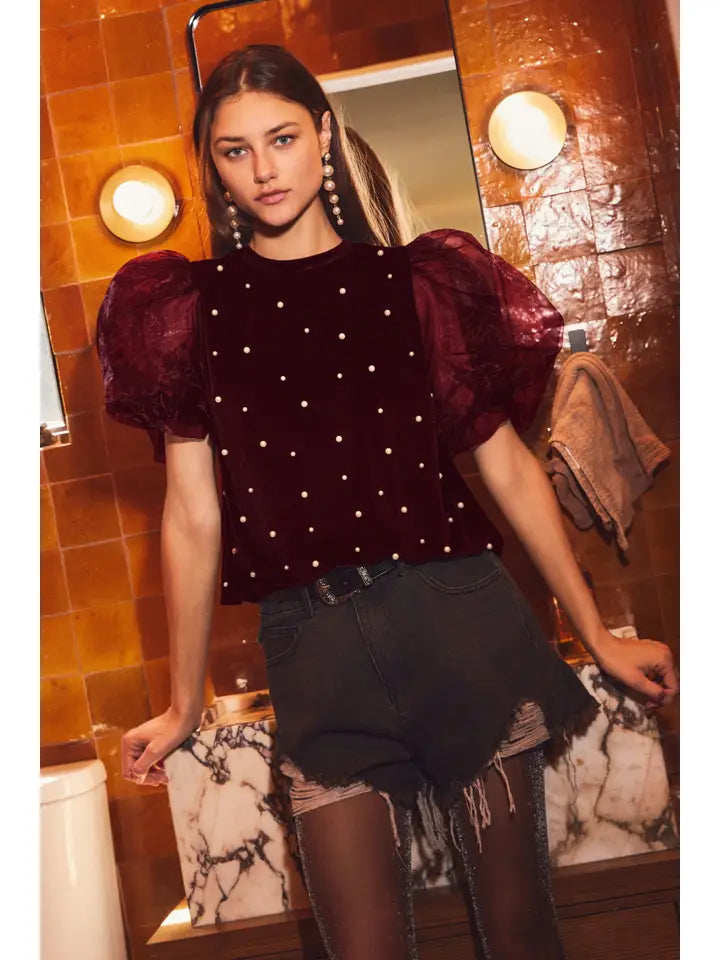 Luxe velvet meets sparkle in this pearl-embellished top that's ready to steal the spotlight. Soft, touchable fabric pairs with shimmering pearl details for a look that's equal parts cozy and glamorous. Perfect for dressing up everyday moments or creating those Instagram-worthy outfits that make you feel absolutely fabulous.
