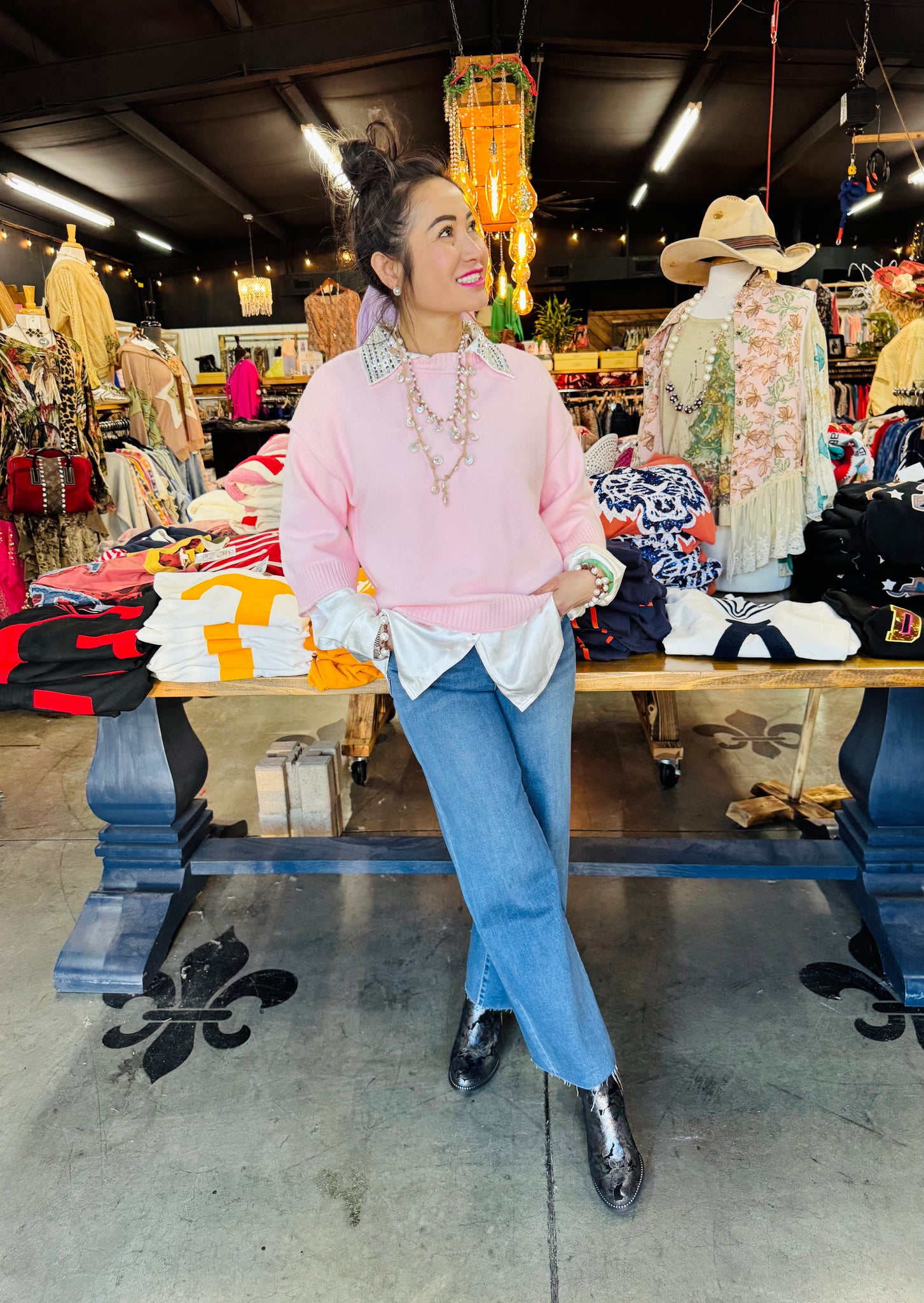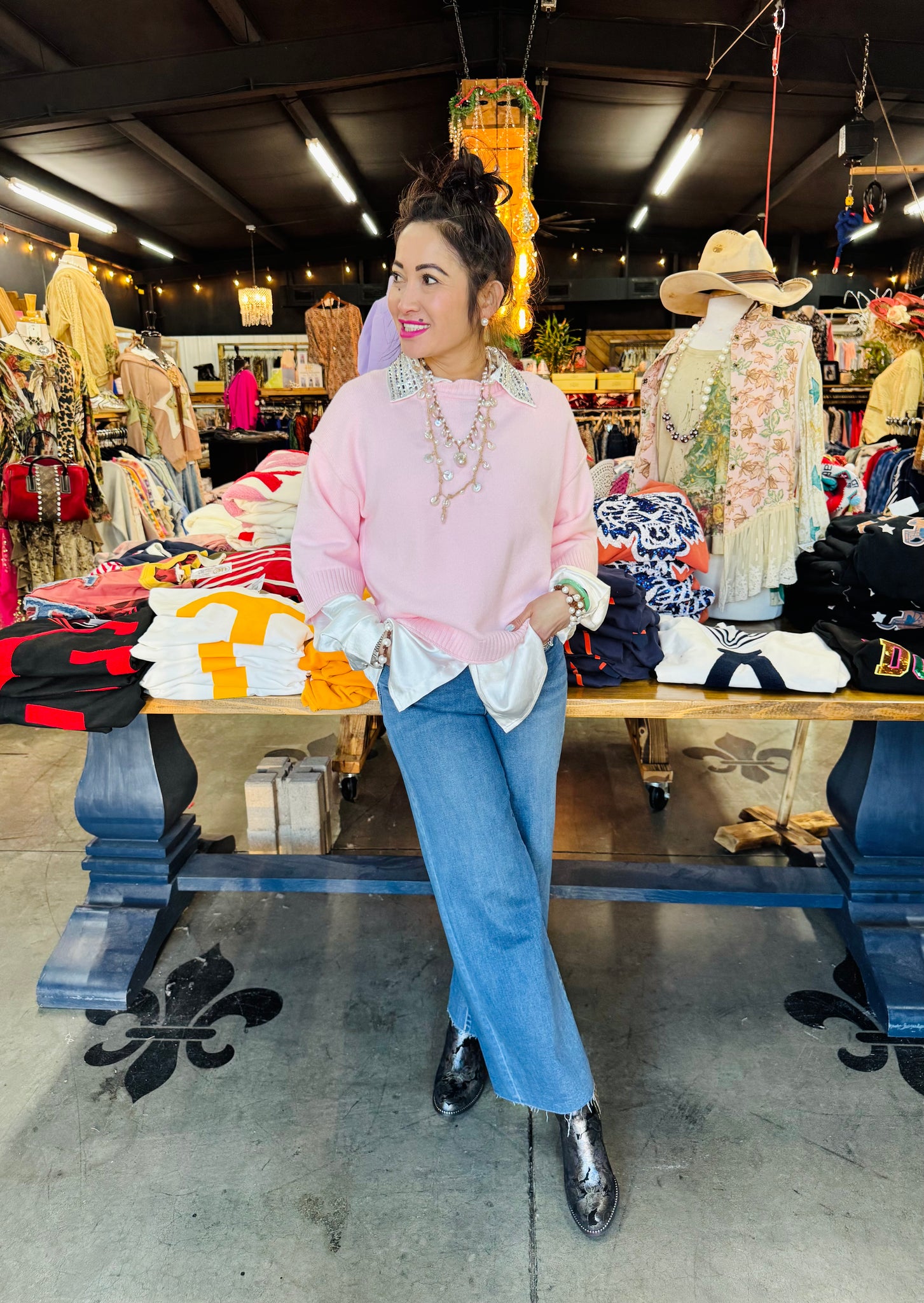 Cozy up in this charming crew neck sweater featuring three-quarter sleeves and signature reverse seams for a modern twist. The soft light pink knit is perfect for layering or wearing solo, bringing effortless style to your everyday rotation. A playful staple that works as hard as you do.