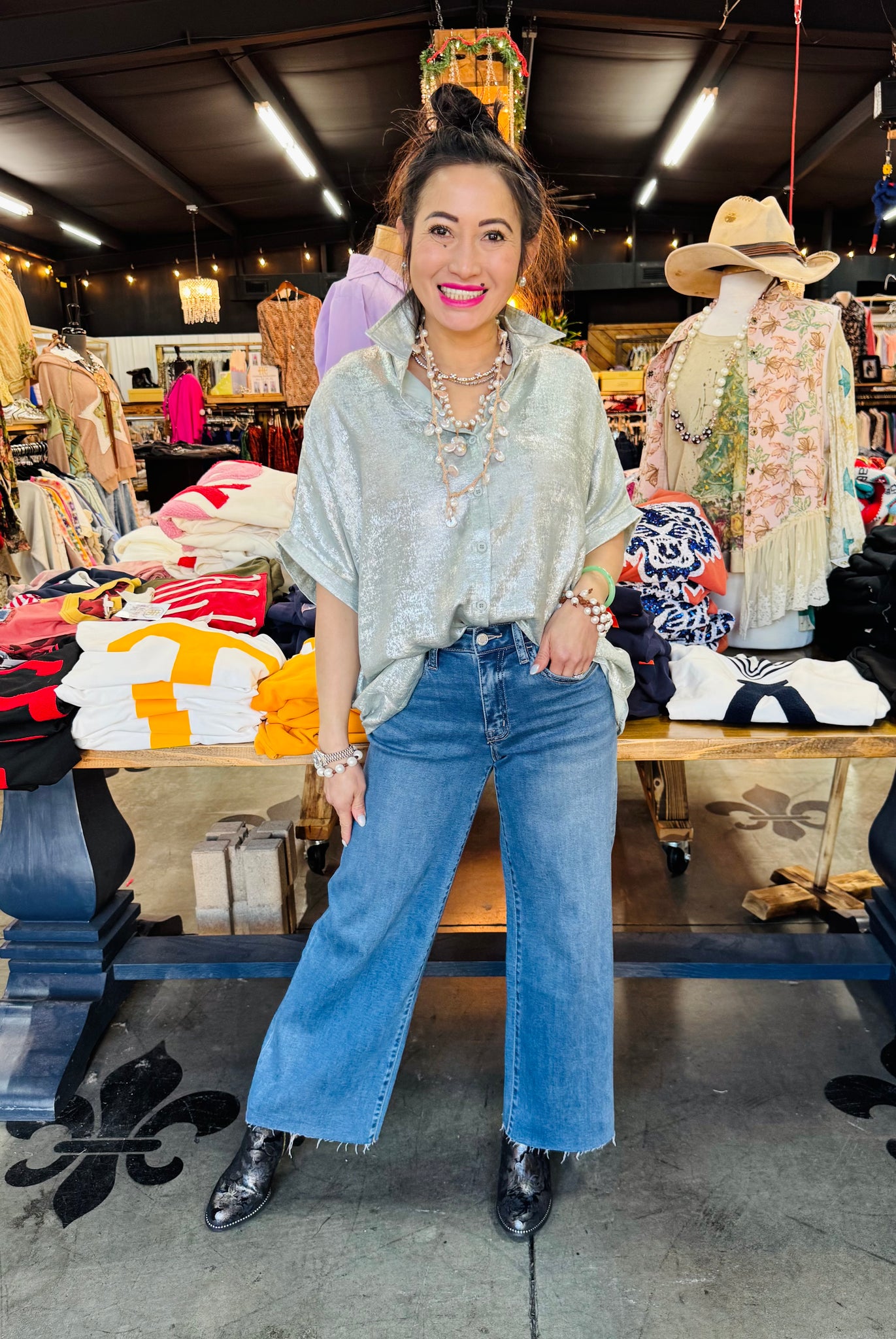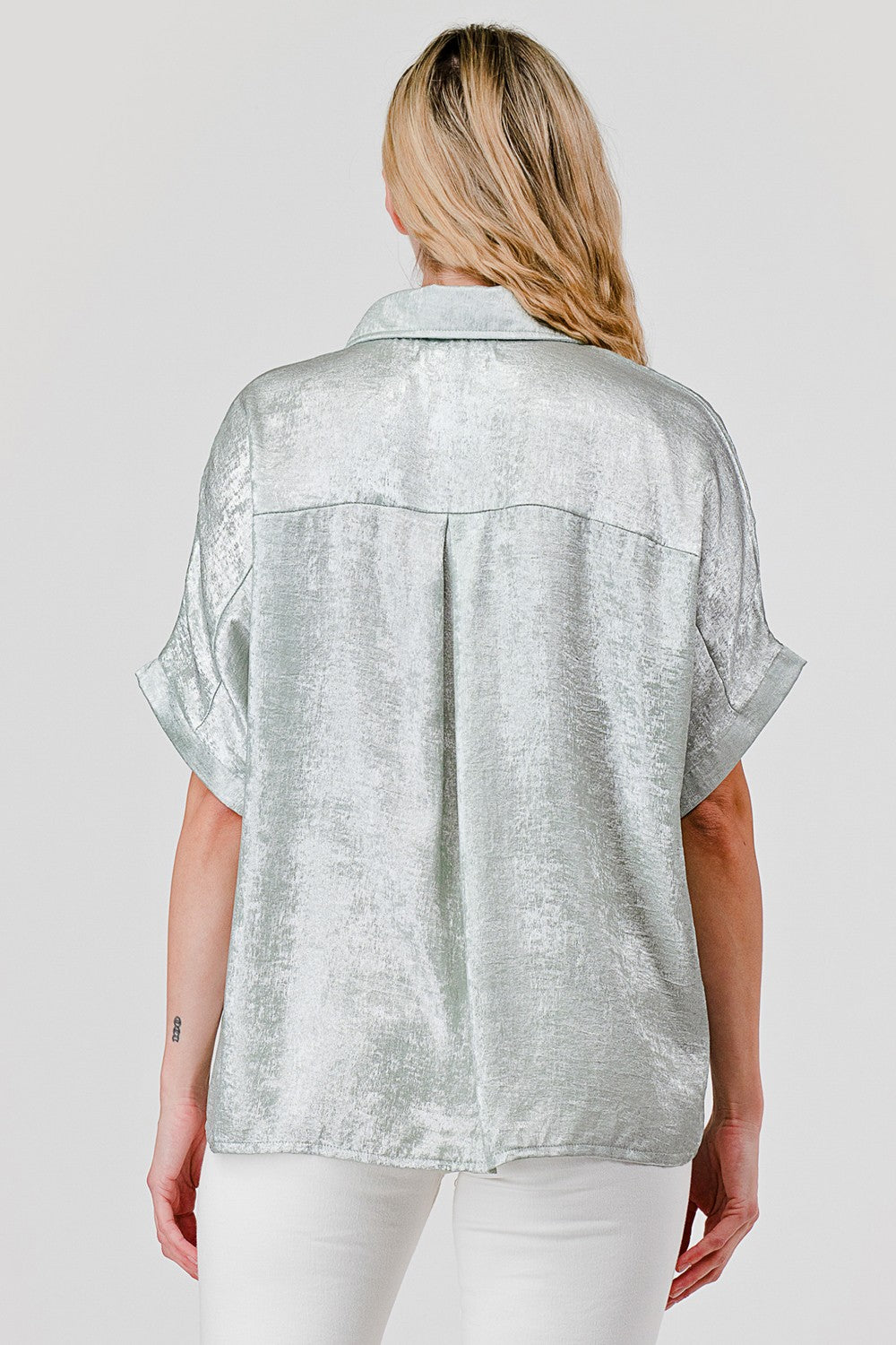 Elevate your everyday style with this charming short-sleeve button-down from Pixi + Ivy. Crafted in a sophisticated sage hue with subtle metallic accents, it's the perfect piece for mixing polished and playful vibes. The classic collared design and button-front closure make it endlessly versatile—dress it up for brunch or keep it casual with your favorite jeans. A wardrobe essential that works as hard as you do.