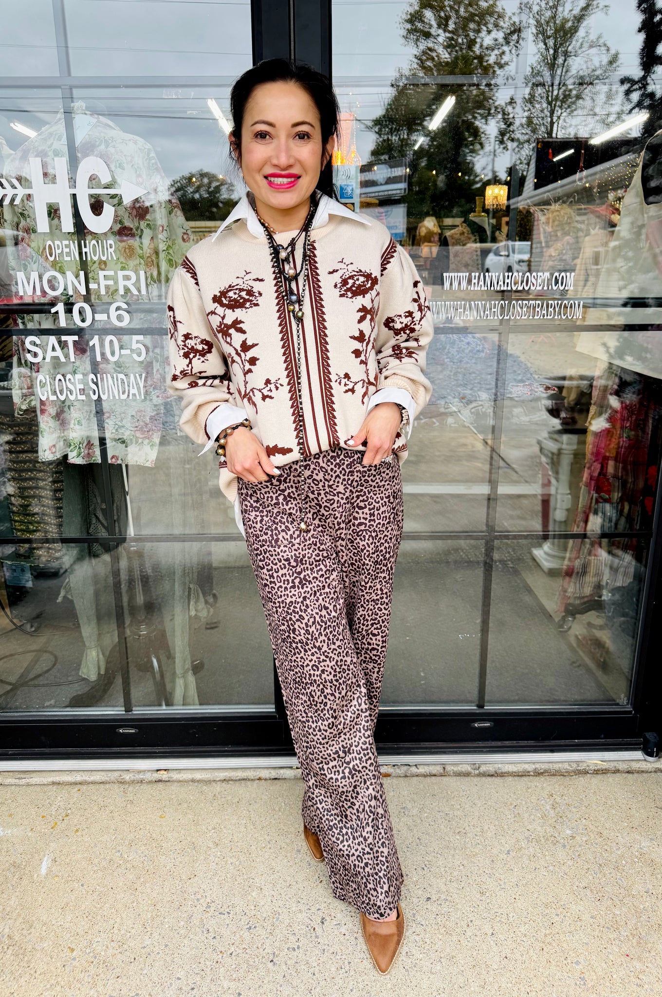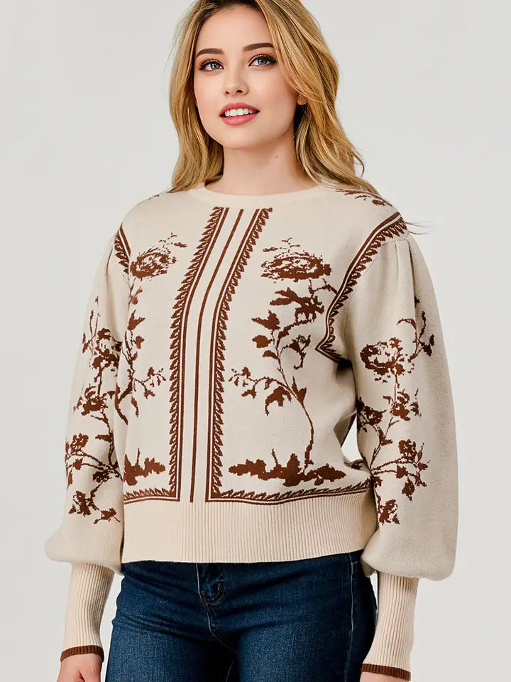 Embrace vintage charm with this delightful border print sweater from Pixy + Ivy! Featuring a timeless floral design in warm cream and brown tones, this cozy knit brings nostalgic elegance to your everyday wardrobe. The intricate border detailing adds a whimsical touch that pairs perfectly with jeans, skirts, or vintage-inspired pieces. Soft, comfortable, and effortlessly stylish—your new favorite layering piece awaits!