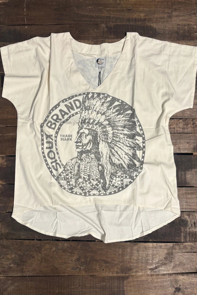 The JADED GYPSY Seasons Best Top - SIOUX CITY is a charming, vintage-style women's top with a rustic vibe, boasting a playful high-low hem and a distressed, double-sided design that echoes the look of a flour sack. Available in a range of sizes, you can snag this unique piece from online favorites like The Jazzy Cowgirl, Let Er Buck, and Boho Wanderlust Boutique.