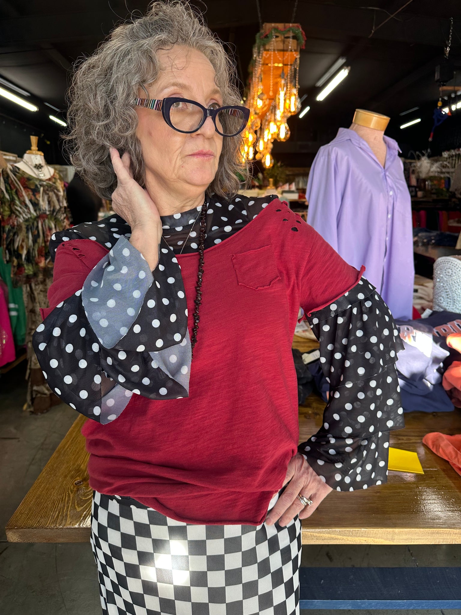 Playful dots dance across sheer mesh on this charming ruffle top from Turquoise Haven. The black-and-white pattern brings a fun, graphic edge while delicate ruffles add movement and dimension. Perfect for layering or wearing solo, this piece brings whimsy and texture to any outfit.