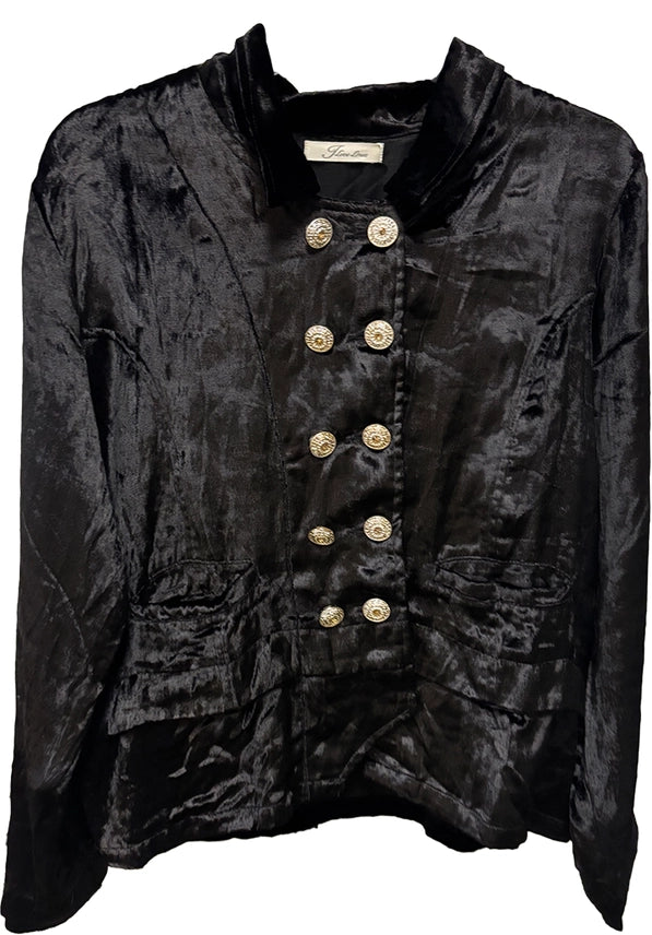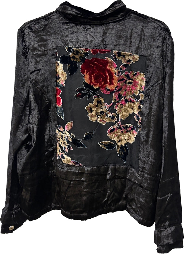 March into fall with military-inspired edge in our Velvet Rayon Jacket, a luxe blend of soft rayon velvet in Black and Silver. Gold-tone military buttons line the double-breasted front, while a stunning burnout velvet floral appliqué blooms across the back for dramatic contrast. Relaxed fit with drop shoulders, patch pockets, and raw-edge cuffs—perfect over tees or dresses. Key Features: Sizes: S/M (2) + L/XL (2) = 4 per case Rayon Velvet Colors: Black and Silver Military style buttons on double breasted front Patch pockets